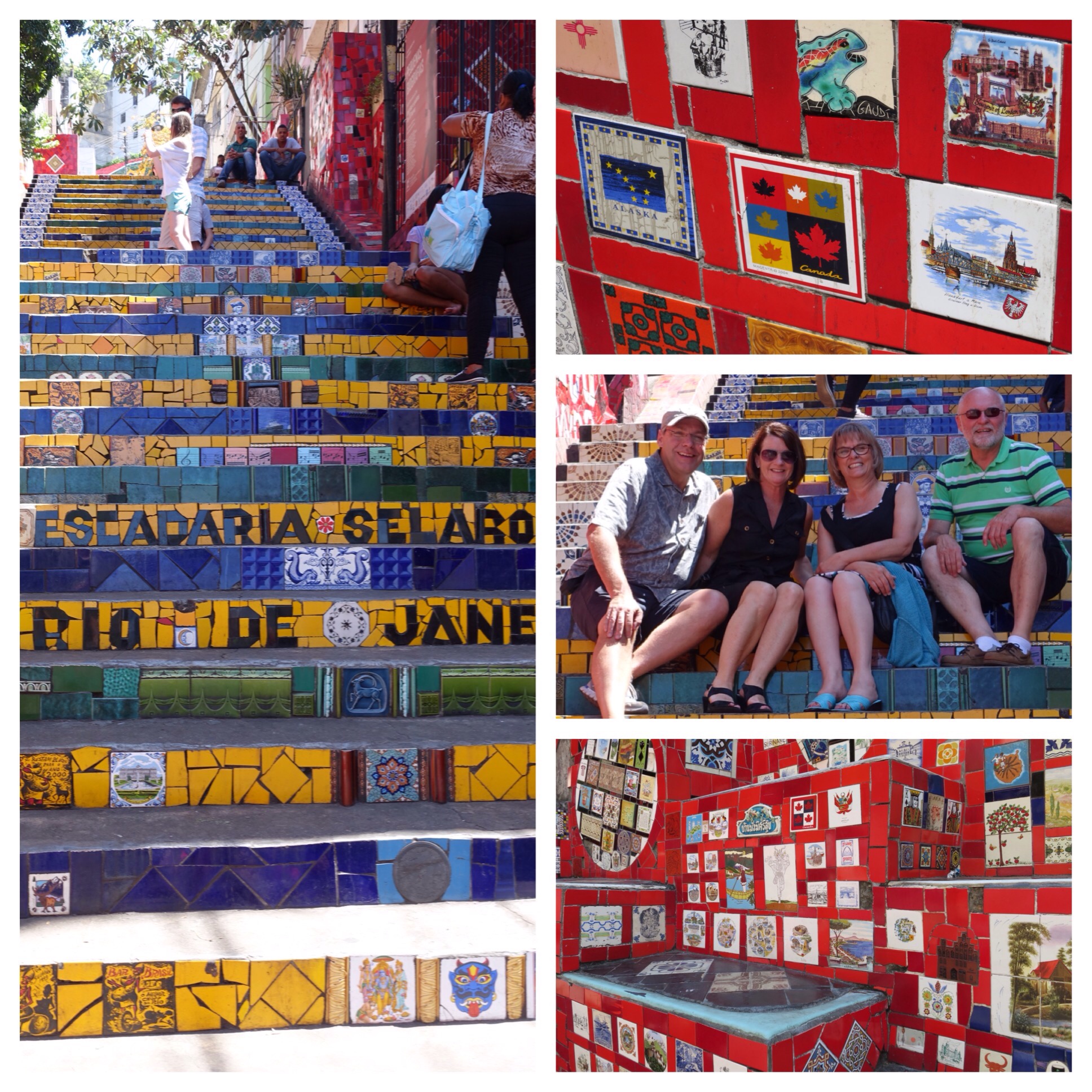 We were fascinated by the Escadaria Selarón, 215 steps leading into the hilltop area of Santa Teresa. Jorge Selarón started the creation of the steps in 1990 and continued adding to the tiles until his untimely death in 2013. It was never conclusively proven whether he was murdered or committed suicide but he was found early one morning dead on the steps.