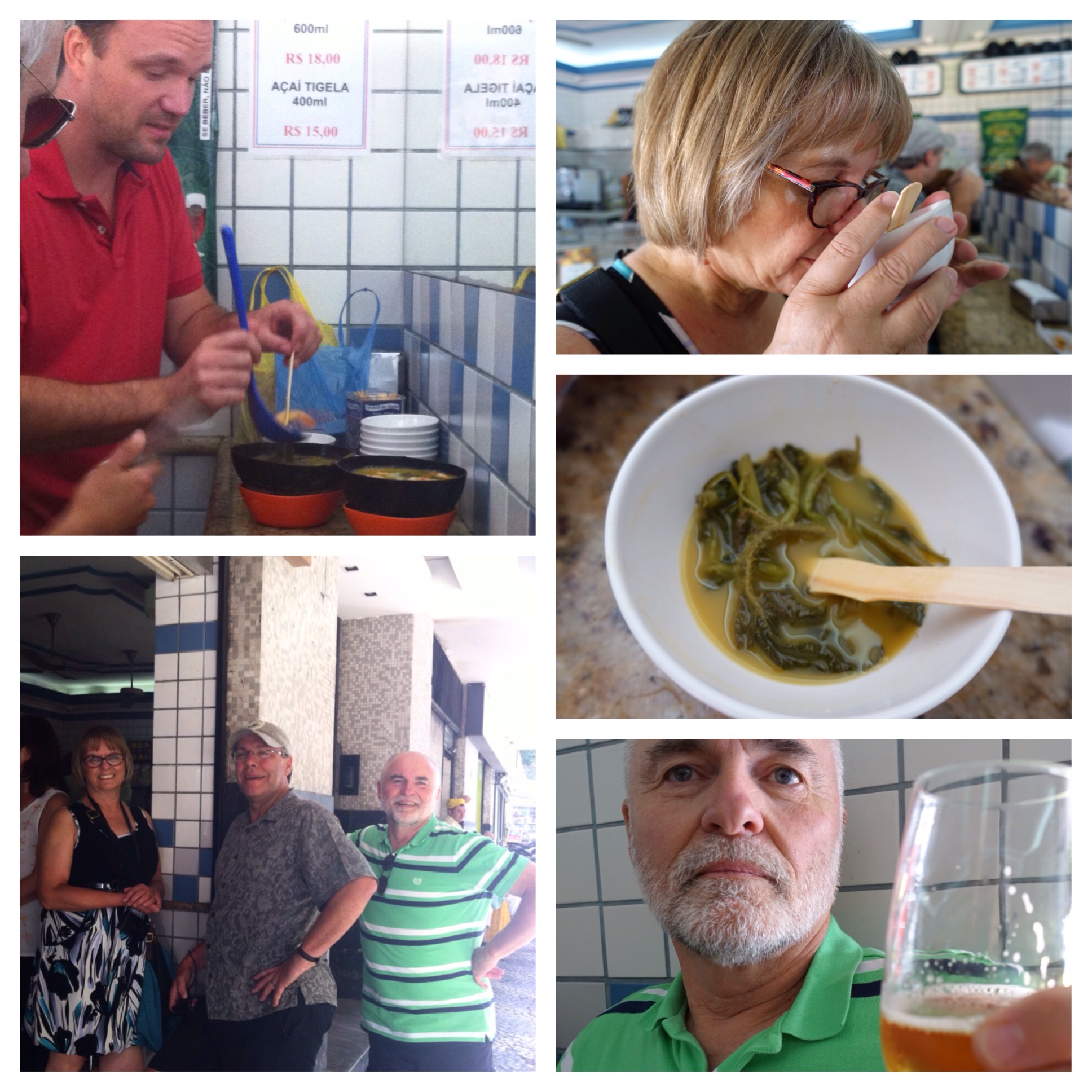 We visited a small cafe, Tacacá do Norte, serving traditional Amazonian fare. Here, in bowls from the backpack, we sampled Tacacá – an Amazonian soup, prepared from a plant that contains poisonous cyanide. The process to detoxify the plant is quite arduous, with a couple of three days steps, and one wonders how this process was developed – how many Amazonians were sacrificed determining the required time periods to arrive at a safe edible product? The soup broth was quite tasty; it also contained a heavily salted shrimp, which most of us found quite dreadful and greens which are often referred to as ‘the toothache plant’ as they left one’s tongue and mouth somewhat numbed for a few seconds after chewing them. The soup was accompanied by two Amazon beers, which, like most Brazilian cervejas we have tried, were very good.
