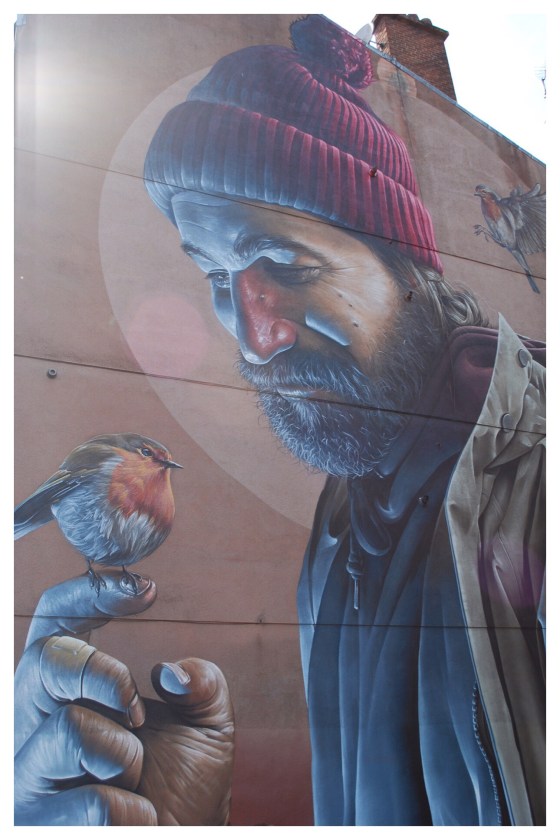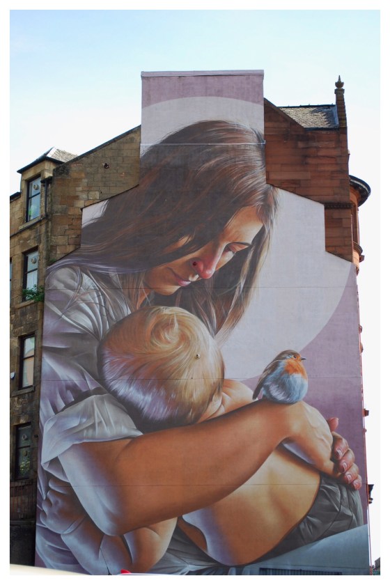 Glasgow City officials have sanctioned the creation of large, edgy murals around the city. One of the most famous is a modern day interpretation of the city’s patron saint, St Mungo, performing one of his miracles, the resurrection of a robin.