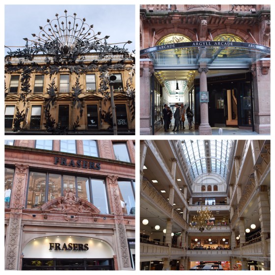 Buchanan, Sauchiehall and Argyle Streets form the “Golden Zed” in the city centre – pedestrian boulevards lined with shopping and restaurants. The Argyll Arcade is the oldest arcade in the city and is filled with high-end jewelry stores. Across the street is Fraser’s, the vast department store often referred to as the Harrods of Glasgow.