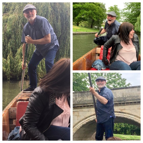 Alexa is recovering from a broken ankle and thought it wouldn’t be a good plan for her to give it a try, and I know my limits so gave it a miss. Harvey took over and caught on quickly, moving the punt along at a good speed and with relatively good steering. Kristin had advised that if the pole sticks in the bottom on the river, you should let go. Unfortunately, when this happened to Harv, he forgot the advice and held on to the pole as the boat was propelled forward. This resulted in half of his body taking a dip in the Cam – he did manage to keep the rest of himself in the boat! And with Harvey’s great attitude, he laughed uproariously and continued on punting. This was of course to the great delight of many of the people on the river and the riverbanks!