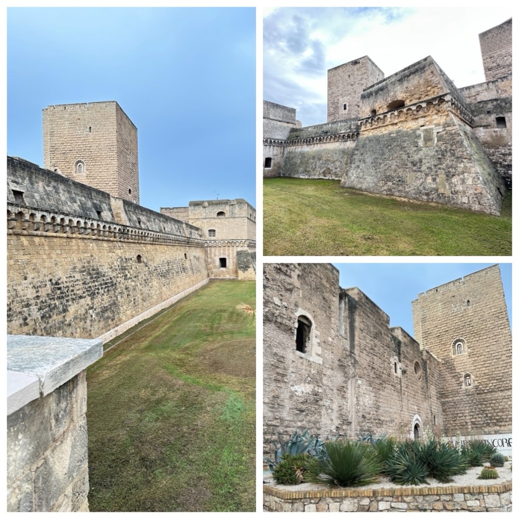 The Castello Normanno-Svevo (Swabian Fortress) also known as the Houenstaufen Castle, was built circa 1132 by the Norman King Roger II. The castle was destroyed in 1156 by King William I (“The Wicked”) of Sicily as he tore his way through Puglia. It was restored by Emperor Fredrick II in 1233. The castle is surrounded by a moat. Each corner of the castle walls has a tower bastion, that were used as a juvenile prison, a maritime aide, a shelter for Saint Francis and the fourth just as the tower of the wind. The centre of the castle features a Renaissance courtyard with an Aragonese staircase. We read a story that in 1221 Frederick II hosted Saint Francis of Assisi in the Swabian Castle. The Emperor sent a courtesan to seduce the saint. As she approached his bed, it was covered with fire. She fled in terror. Frederick (who had been spying on the saint) was very impressed. The courtesan could not be reached for comment.