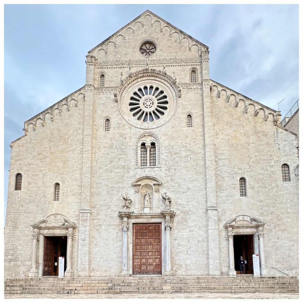 There had been a church on the site of the Cattedrale di San Sabino (Bari Cathedral) since the 6th century. The current Cathedral, consecrated in 1292, is an example of Apulia Romanesque, with a plain facade in three parts, set off by two pilasters. The main portal is in the center, below a large rose window.