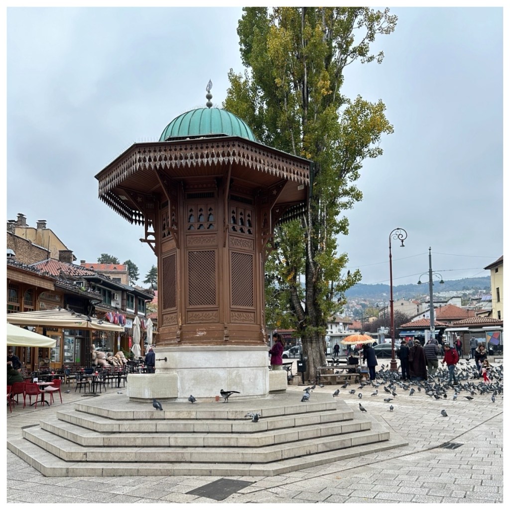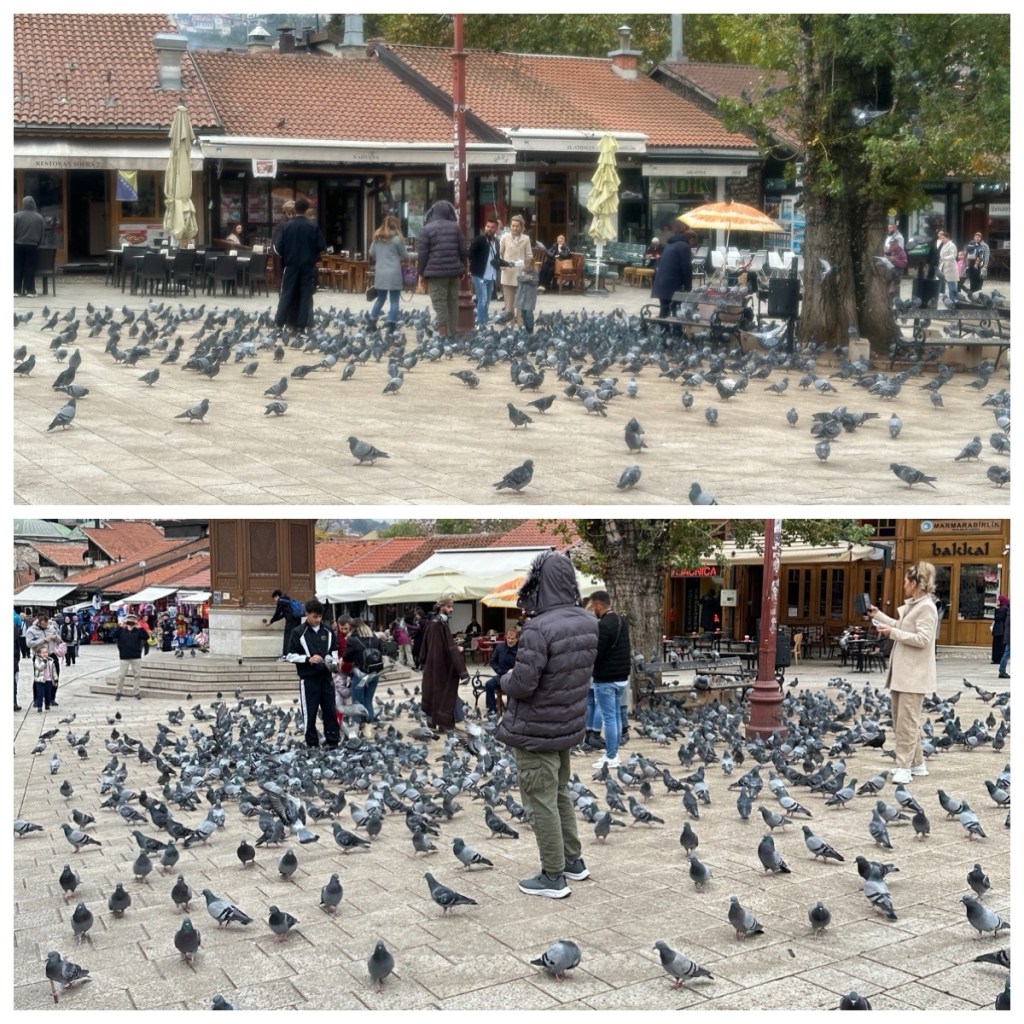 The centre of the Ottoman old town is the square of Baščaršija. Literally translated as Main Marketplace, the name has come to represent the entire Old Town. Despite its official name, the square is nicknamed Pigeon Square – and it’s not hard to see why!!
