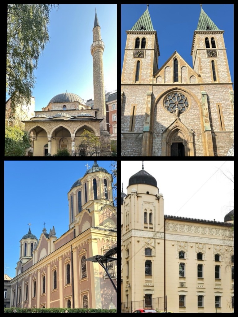 Within a few blocks, you can view a mosque, a cathedral, a synagogue and an Orthodox church. Clockwise from top left – the Ferhadija Mosque, Catholic Cathedral of the Sacred Heart, Sarajevo Synagogue and Serbian Orthodox Cathedral. You hear the Muslim call to prayer intermingled with the Catholic and Orthodox church bells in a pleasant mix of cultures.