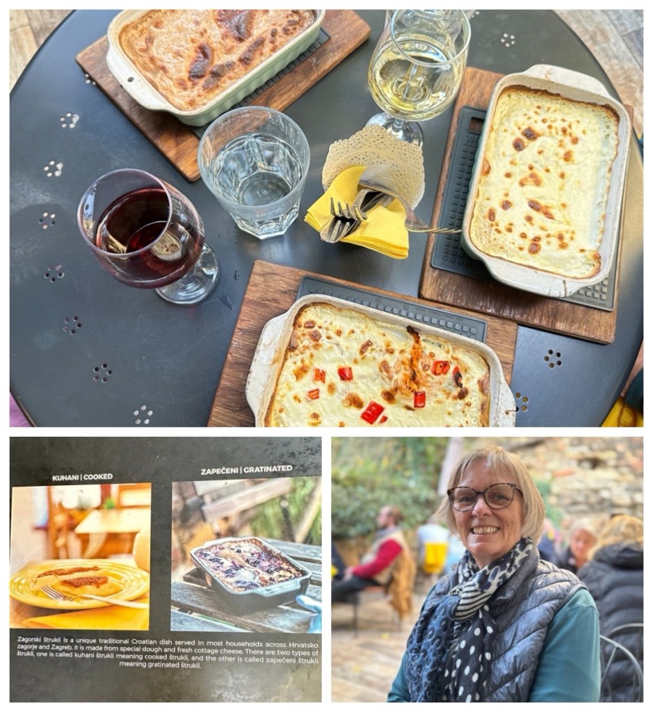As always, we enjoyed the food in Zagreb. At La Štruk, they serve only Štrukli – a traditional Croatian specialty. Zapečeni strukli is made from special dough and fresh cottage cheese with a variety of fillings, baked in a small casserole and topped with gooey cheese and breadcrumbs. In their lovely outside garden, we ordered three versions of this gratinated delight – salty cheese, roasted pepper and apple/cinnamon. We soon learned that three choices was definitely too much for two people – but we thoroughly enjoyed it!