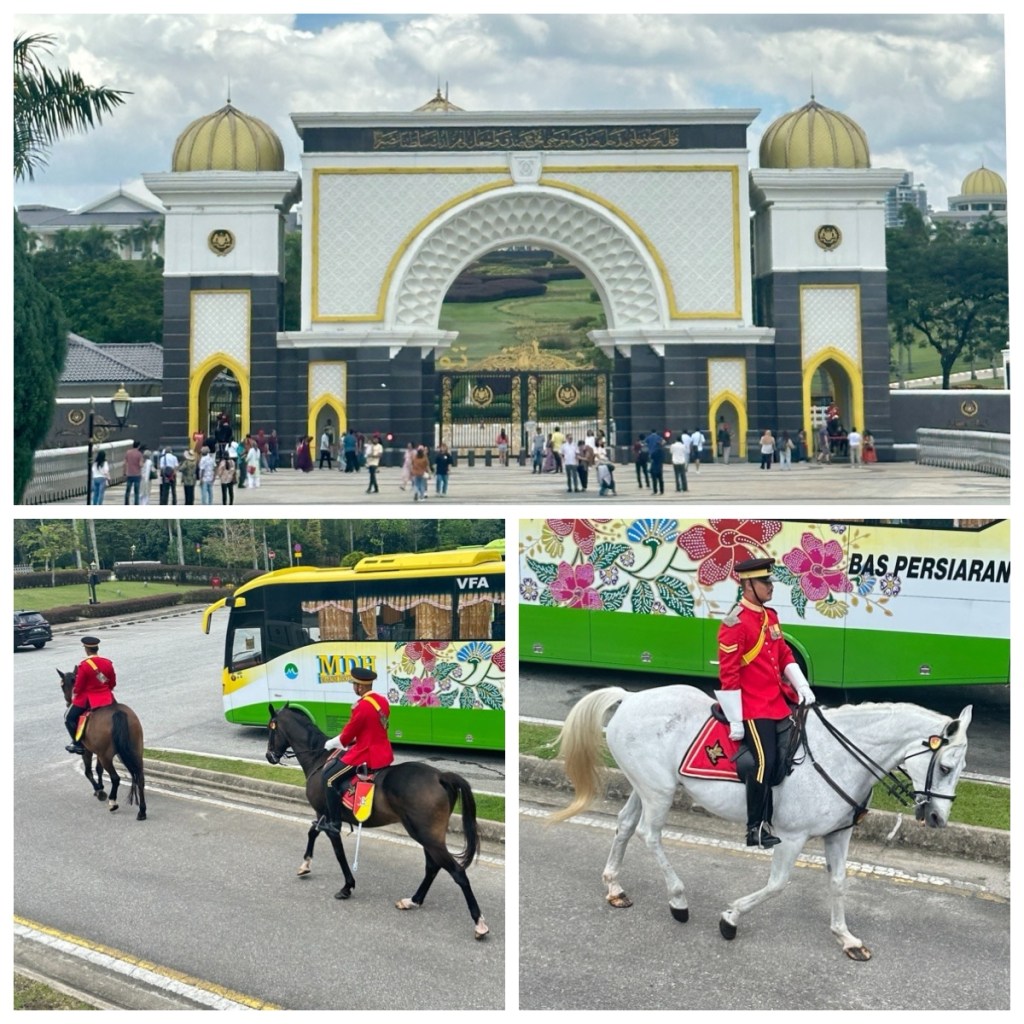 Our bus made a stop at the National Palace (Istana Negara). This is the official residence of the Yang di-Pertuan Agong (King of Malaysia). The palace complex, opened in 2011 has an area of 97.65 hectares, 22 domes, and is split into three main portions: the Formal Component, Royal Component and Administration Component. The two biggest domes are designed in the form of neatly layered beetle leaves. The public are not admitted to the palace grounds – you can only peer through the gates so we didn’t hop-off. We did see the guards riding to and from a short changing of the guards ceremony.