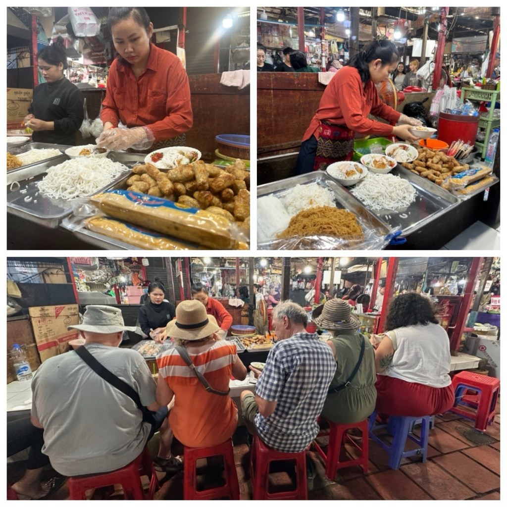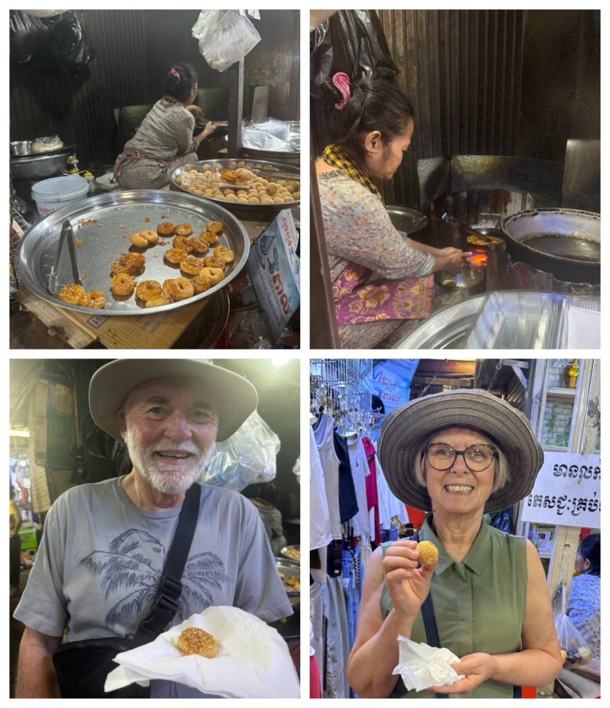 After this great meal, we wandered about the market a bit more and stopped to sample Cambodian doughnuts – Nuom Kong. There were three types, all soft and chewy on the inside and deliciously crunchy on the outside, with a mildly sweet nutty favour. Each of us had our own favourite.