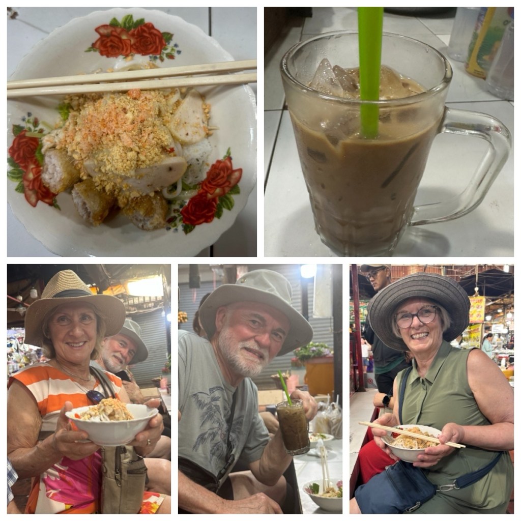 Jackson led us to a food vendor where he arranged our first breakfast – Banh Sung. Banh Sung is a typical Cambodian dish that includes rice noodles, crispy caramelized pork, fried spring rolls, fresh vegetables (carrots, cucumbers, bean sprouts), mint, Thai basil, crushed peanuts and is drizzled with a sweet and savoury sauce made of coconut milk, spring onions and spring roll sauce. It was fun to watch it being prepared and even more fun to eat as it was absolutely delicious. We also loved the Cambodian Iced Coffee, made with sweetened condensed milk.