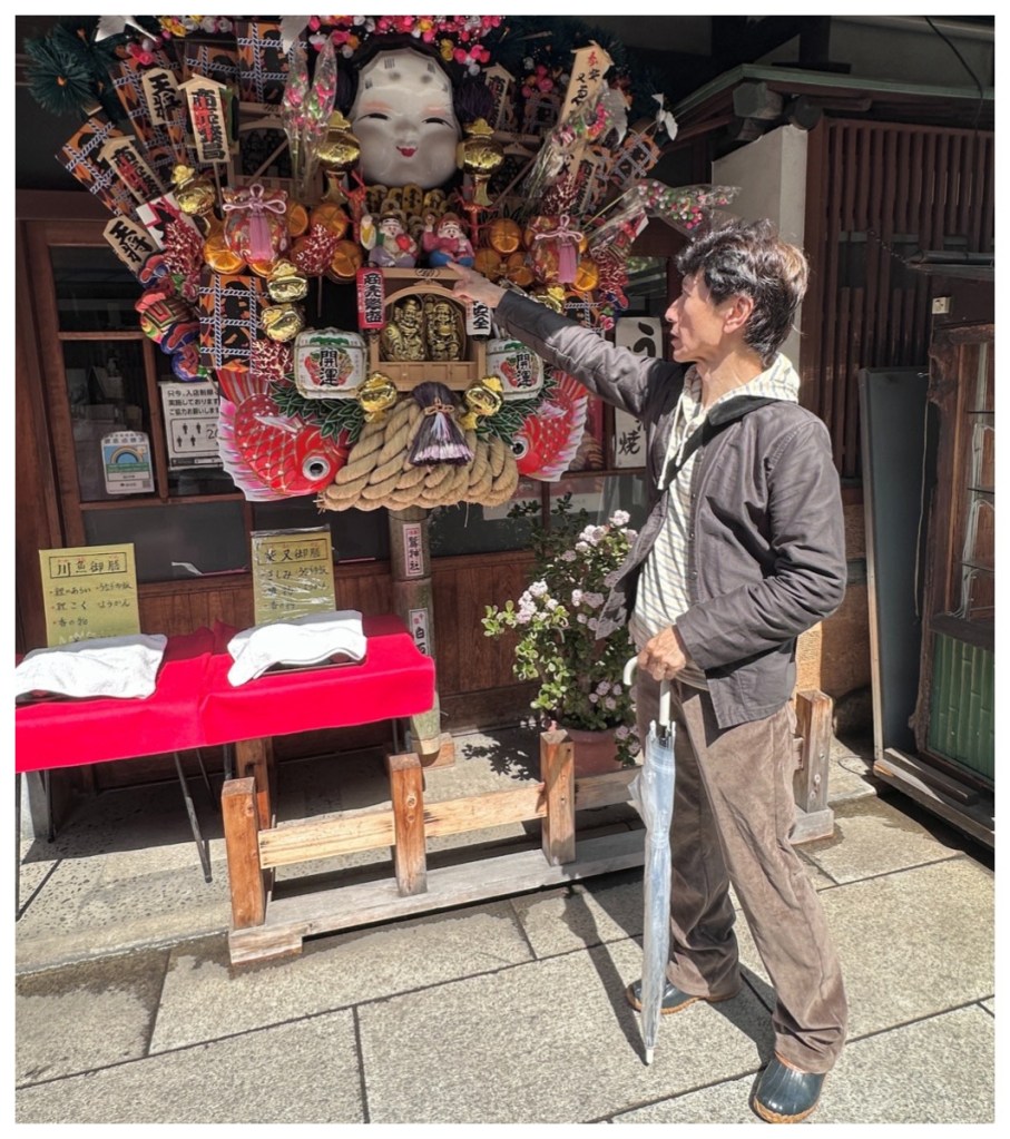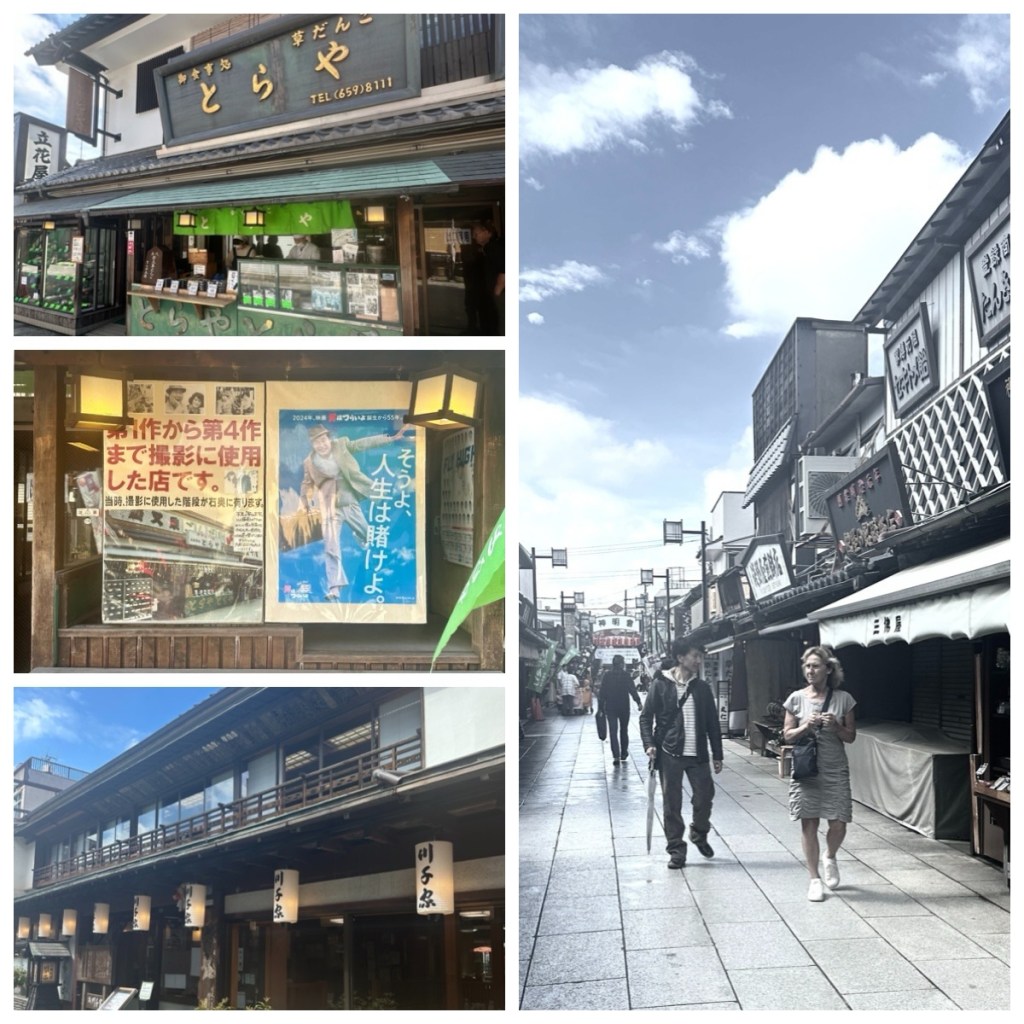 We traveled to the area of Shibamata in eastern Tokyo. The town is full of nostalgic atmosphere and was quite free of crowds. It is also very proud of to be the hometown of Tora-san, the protagonist of a highly popular series of 48 movies. Otoko wa Tsurai yo (“It is tough being a man”) was filmed from 1969 to 1995. In the movies, Tora-san, a hustler who was always unlucky in love, visits each of Japan’s prefectures but always returns to Shibamata. This solidified the area’s reputation as a traditional neighbourhood emblematic of ‘old Tokyo’. Bronze statues of Tora-san and his sister, Sakura, greet you outside Shibamata Station – Tora-san, looking back before leaving his hometown, and Sakura, seeing him off.