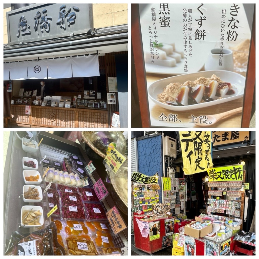 The central street in Shibamata is Taishakuten Sando. This 200 meter long street is lined with restaurants and shops selling local specialties such as mango, skewered rice flour balls, doriyaki pancakes, Japanese crackers and sweet rice dumplings. Posh introduced us to Kuzumochi, a sweet made from kuzuko starch (derived from the kudzu plant) topped with kinako (toasted soybean flour) and kuromitsu (black sugar syrup). It has a jelly-like, slightly chewy texture and I must admit that it was not my favourite treat of the trip.