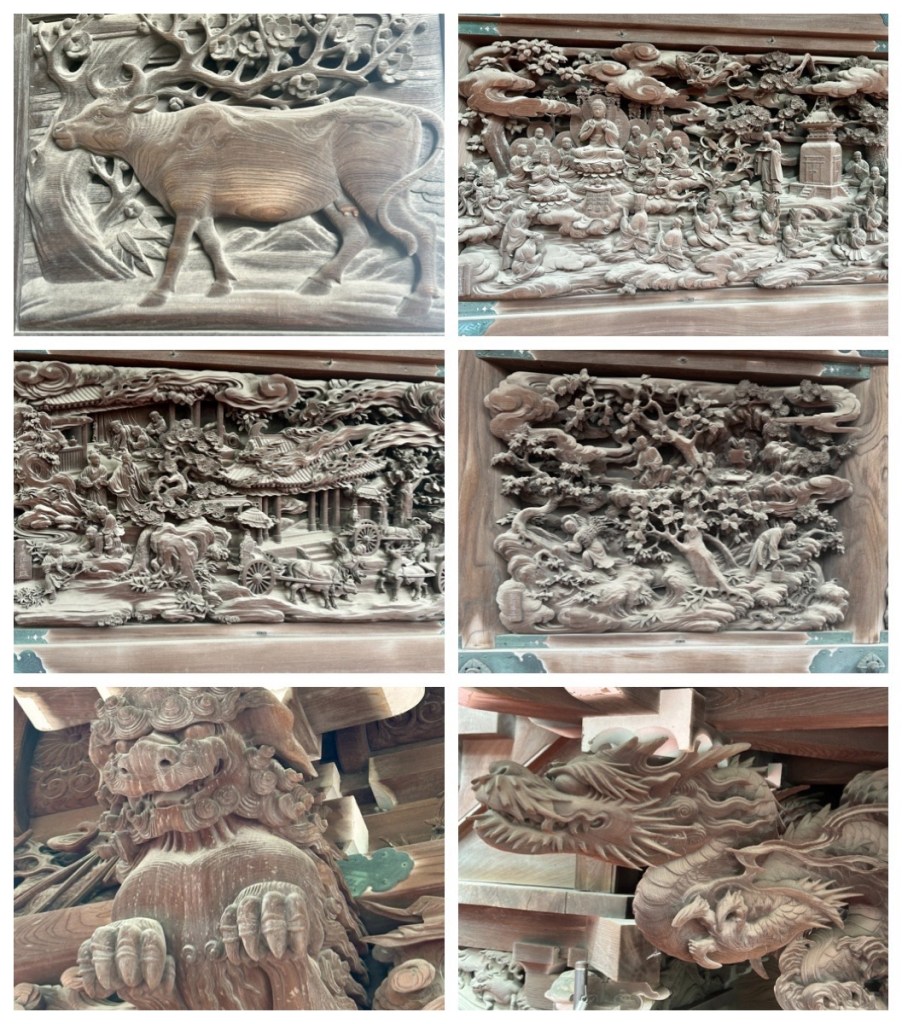 Shibamata Taishakuten is famous for its wooden carvings. While most of Taishakuten’s buildings are covered in wooden carvings, the most significant are at the the back of the Taishakudo Hall. Ten panels of intricate carvings cover the outer walls of the hall, all based on scenes of the Lotus Sutra and each telling a different story. Placards below the panels tell the stories in English and Japanese. Posh was able to share many of the stories with us. The carving technique was amazing, with three dimensional, minute detail. Posh also told us how the panels are too delicate to be properly cleaned. Therefore, to preserve their integrity, they are only brushed to remove cobwebs once a year.