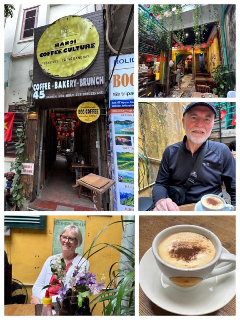 Stop #1: To celebrate this accomplishment, we went for egg coffee! Rather than elaborating on this drink that you find everywhere in Vietnam, I refer you to out travelling companion Debbie’s great blog devoted to the topic – “You never forget your first time (drinking egg coffee in Hanoi, Vietnam)”. Those of you who know me well know that I’m a tea drinker, not coffee – but I must say egg coffee – and others that I’ll mention later – could convert me to coffee. However, I don’t think it would be the healthiest full-time drink! 😉😳