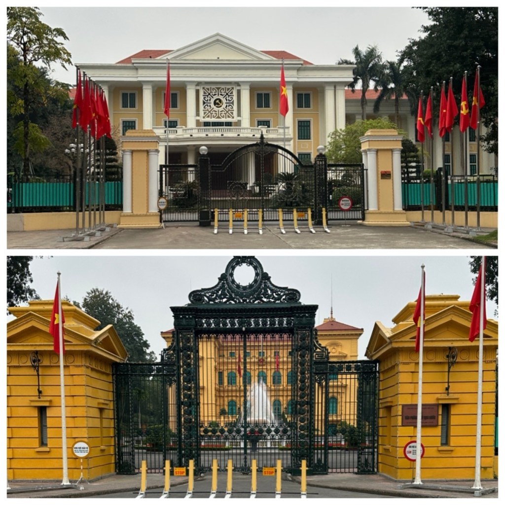 Hanoi is situated in northern Vietnam on the western bank of the Red River. It has about 9 million people and is the capital of Vietnam. This is quite obvious by the number of grand government buildings in the city. We would have had more pictures of the buildings but at one point as Harvey and Larry looked through the fence, a guard approached and told them “Get Away”.