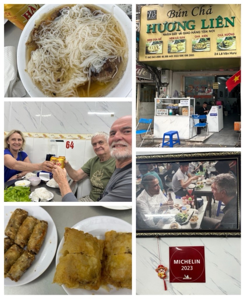 Stop #6: For lunch, Sinh took us to Bún chả Hương Liên. This restaurant serves traditional street food and is mentioned in the Michelin Guide. The restaurant plays up its claim to fame: President Obama and Anthony Bourdain lunched here in 2016 and photos are proudly displayed. Sinh ordered us the ‘Obama Combo’: fried seafood rolls a bowl of the special bún chả and a bia hà nội beer. The bún chả is a tasty blend of smoky pork, meat patties, fragrant herbs and fresh salad leaves.