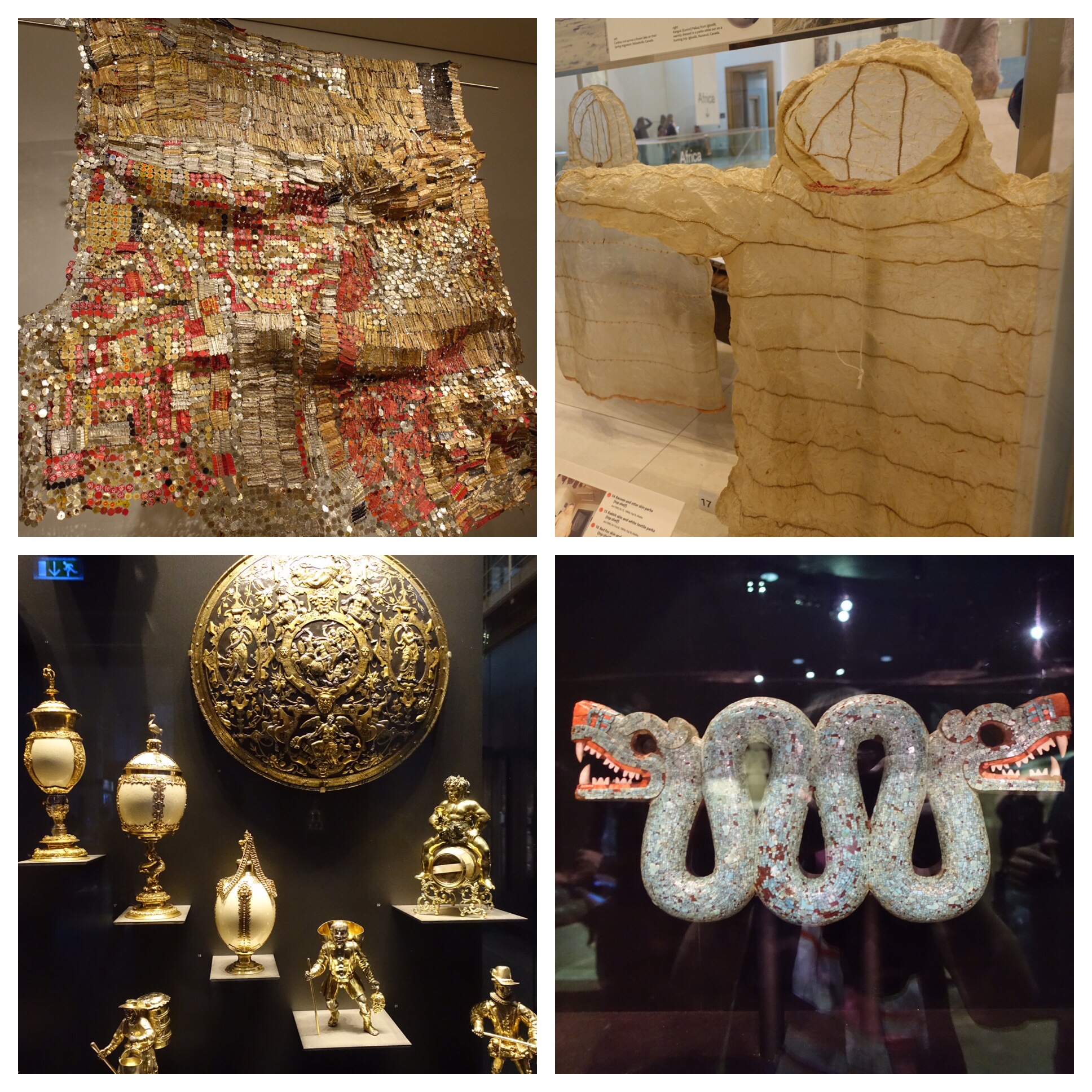 Other exhibits include artifacts from all corners of the globe, including an African cloth made from soda bottle caps, a seal gut parka from the Canadian Arctic, gold from the Rothschild collection and an intricate two-headed snake from Mexico.
