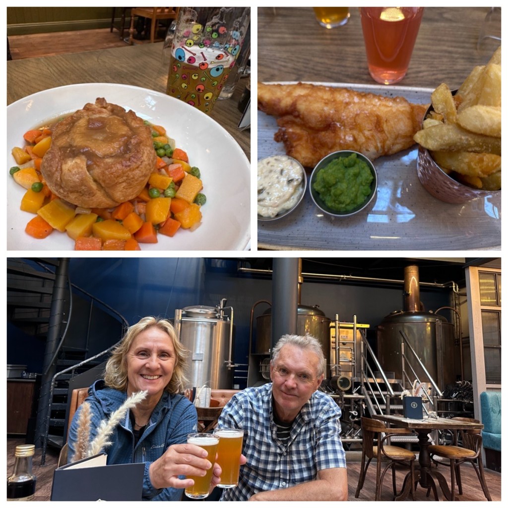 After the library, we wandered through the Bloomsbury neighbourhood (which is where our hotel was when we visited in December) and stopped at a pub, the Marquis of Cornwall, for an early dinner. Quite a traditional meal – fish & chips for Harv and chicken & mushroom pot pie for Bev – and our first pints of the trip!